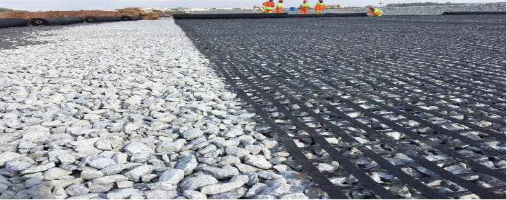 •How It Works: The manufacturing process (punching and drawing) aligns the polymer molecules, creating a very stiff grid with high tensile strength in its two primary directions. When placed between two layers (e.g., between soft subgrade and a gravel base), it: