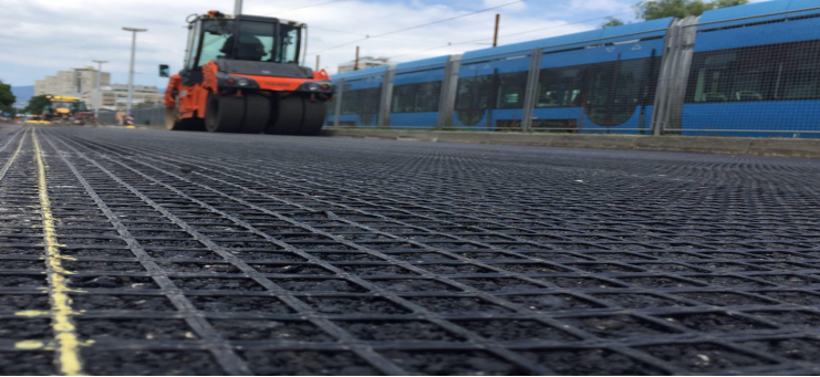 Asphalt Composite Grid is a composite interlayer comprising a grid of glass filament bundles stitch bonded to a non-woven fabric.The high modulus glass filaments provide high absorption of stress at low strains.After being saturated with bitumen the fabric performs a sealing function.Asphalt Composite Grid provides reinforcement, stress relief and sealing functions.